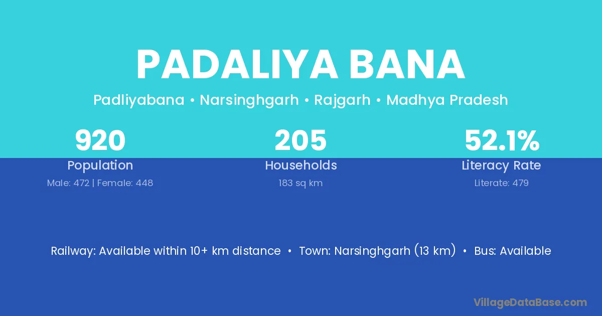Narsinghgarh (13 km) is the nearest town to Padaliya Bana village for major economic activities and is located approximately 13 km away.