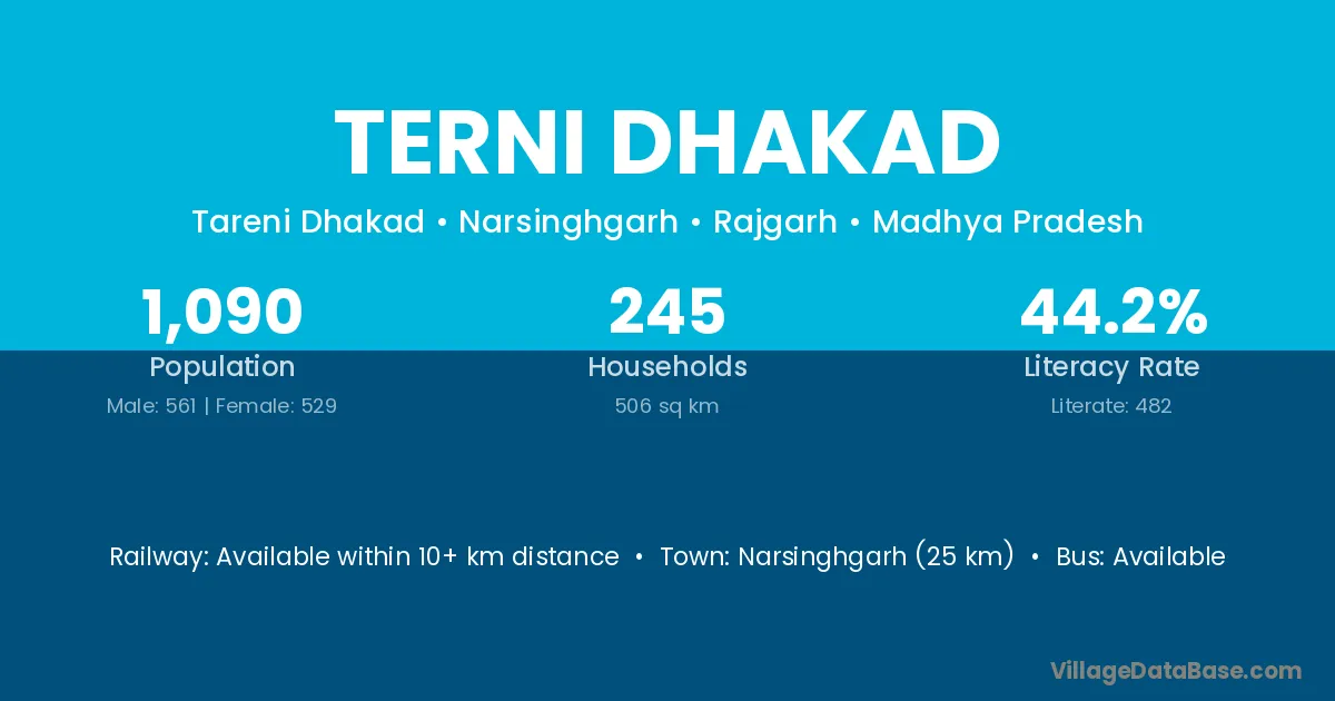 Narsinghgarh (25 km) is the nearest town to Terni Dhakad village for major economic activities and is located approximately 25 km away.