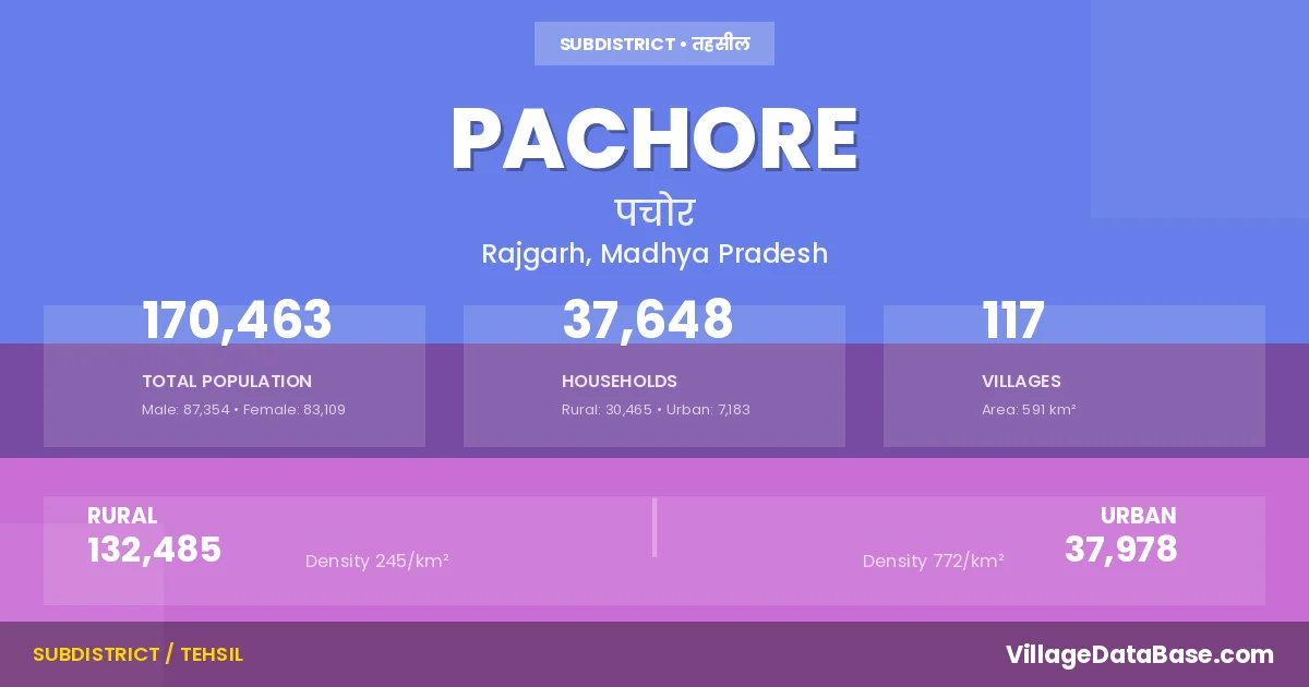 According to the 2011 census The total area of Pachore Tehsil is 591 km², with a population of 170463 people. The population density is 289 inhabitants per square kilometre, and there are approximately 37648 houses in the sub district.