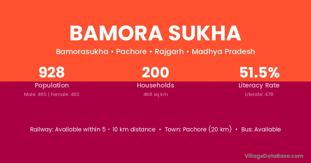 Pachore (20 km) is the nearest town to Bamora Sukha village for major economic activities and is located approximately 20 km away.