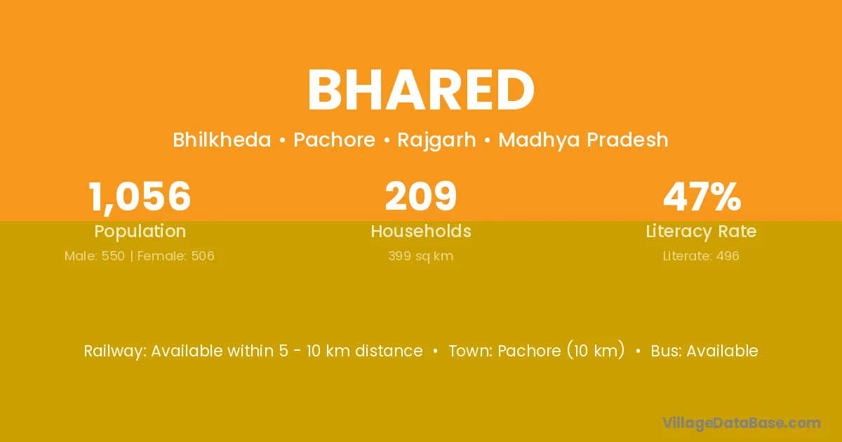 Pachore (10 km) is the nearest town to Bhared village for major economic activities and is located approximately 10 km away.