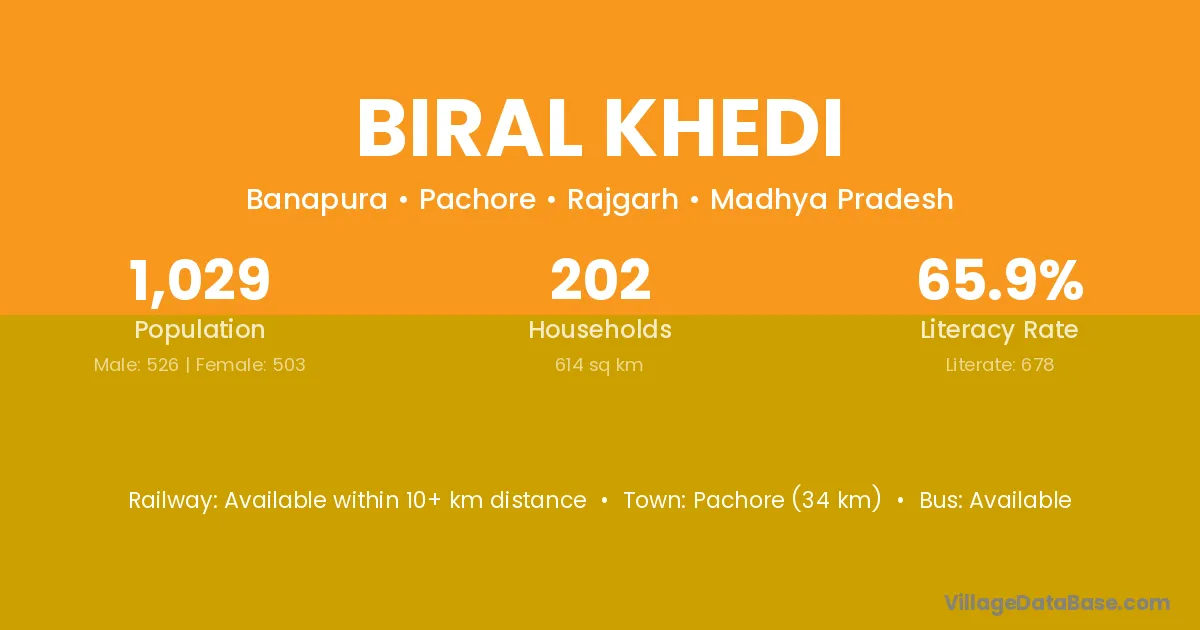 Pachore (34 km) is the nearest town to Biral Khedi village for major economic activities and is located approximately 34 km away.