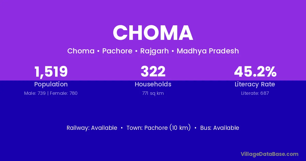 Pachore (10 km) is the nearest town to Choma village for major economic activities and is located approximately 10 km away.