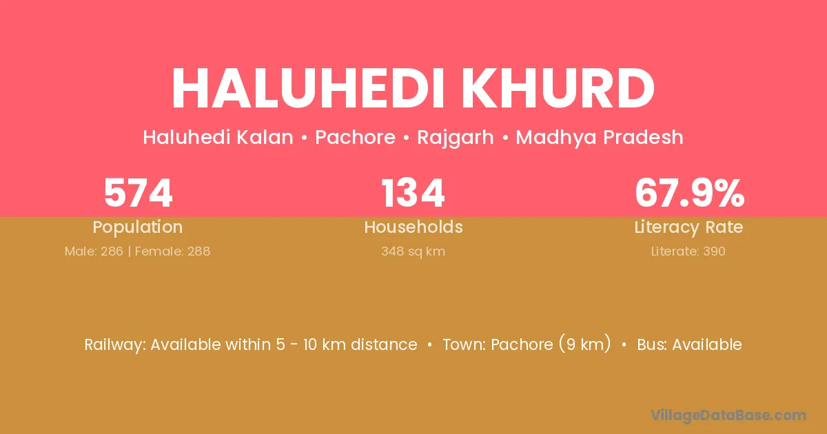 Pachore (9 km) is the nearest town to Haluhedi Khurd village for major economic activities and is located approximately 9 km away.