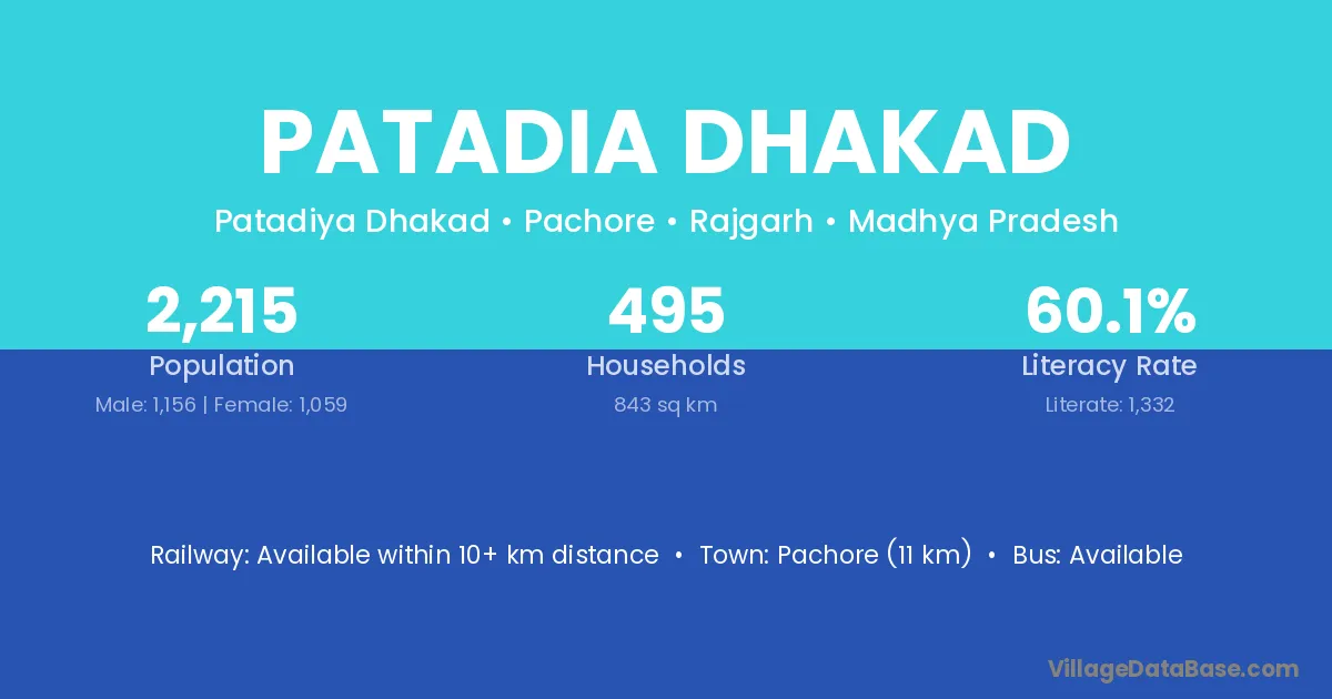 Patadia Dhakad village has a total population of 2,215 people, of which 1,156 are males and 1,059 are females.