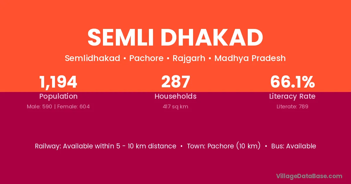 Semli Dhakad village has a total population of 1,194 people, of which 590 are males and 604 are females.