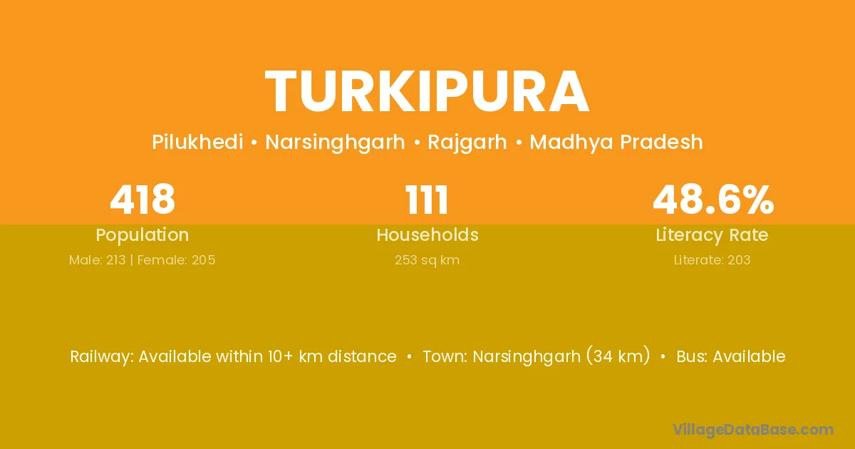 Pachore (30 km) is the nearest town to Turkipura village for major economic activities and is located approximately 30 km away.