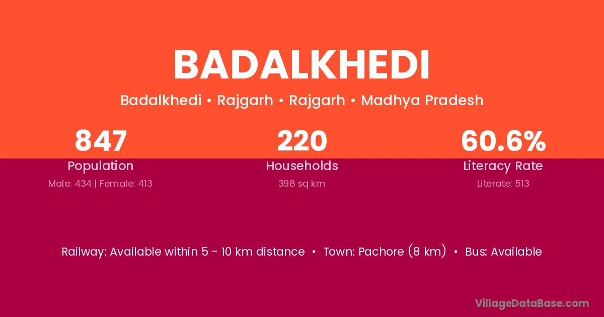 Pachore (8 km) is the nearest town to Badalkhedi village for major economic activities and is located approximately 8 km away.