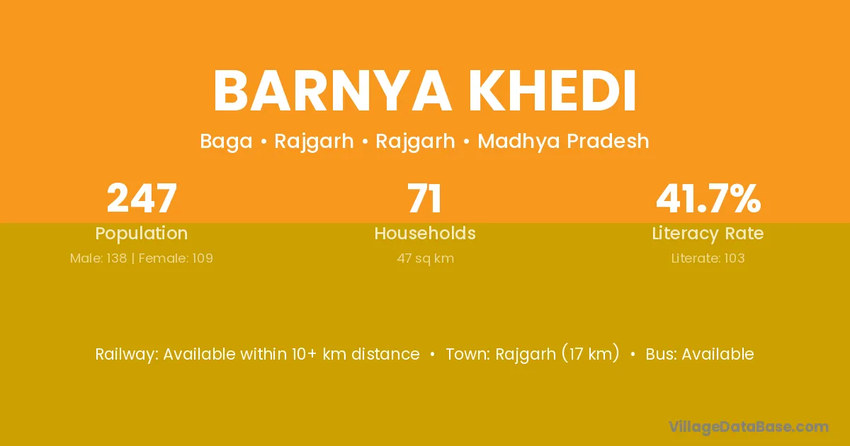Barnya Khedi village has a total population of 247 people, of which 138 are males and 109 are females.