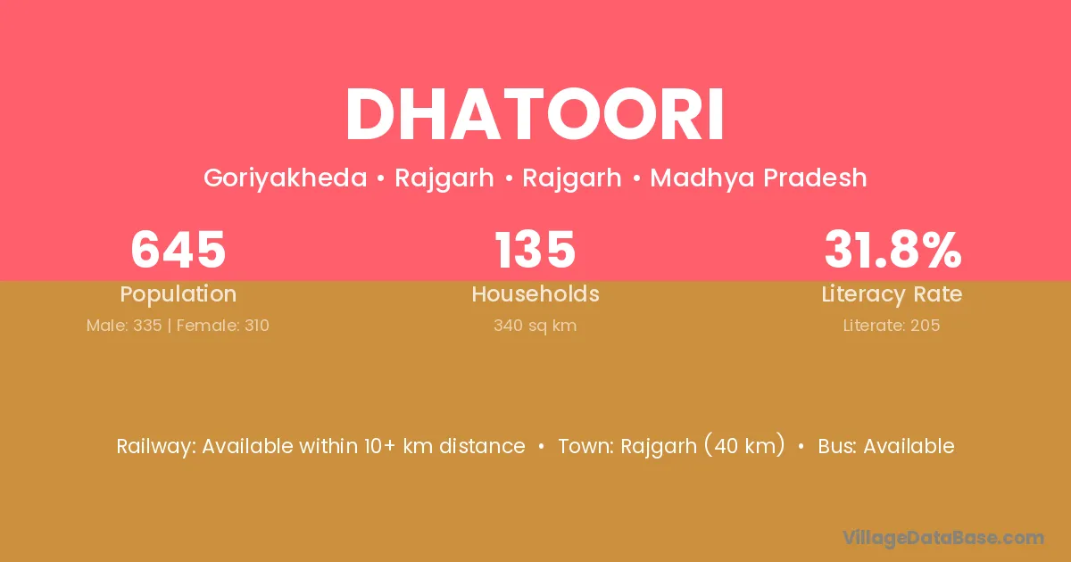 Rajgarh (40 km) is the nearest town to Dhatoori village for major economic activities and is located approximately 40 km away.