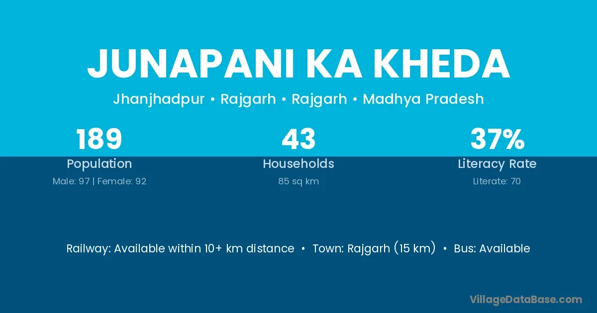 Junapani Ka Kheda village has a total population of 189 people, of which 97 are males and 92 are females.