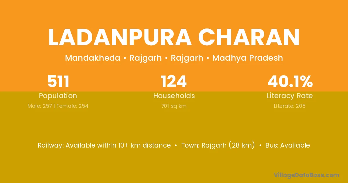 Ladanpura Charan village has a total population of 511 people, of which 257 are males and 254 are females.