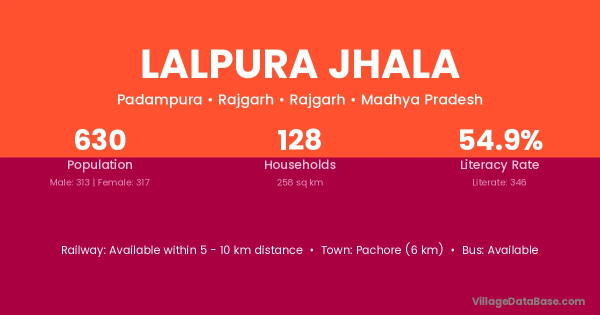Pachore (6 km) is the nearest town to Lalpura Jhala village for major economic activities and is located approximately 6 km away.