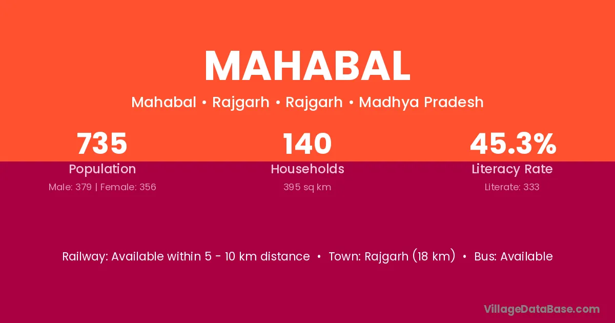 Rajgarh (18 km) is the nearest town to Mahabal village for major economic activities and is located approximately 18 km away.