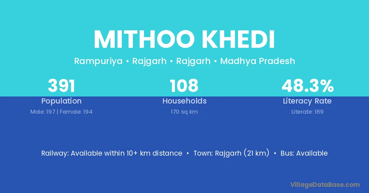 Rajgarh (21 km) is the nearest town to Mithoo Khedi village for major economic activities and is located approximately 21 km away.