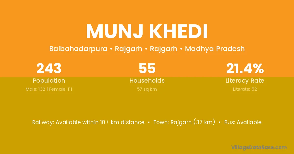 Rajgarh (37 km) is the nearest town to Munj Khedi village for major economic activities and is located approximately 37 km away.