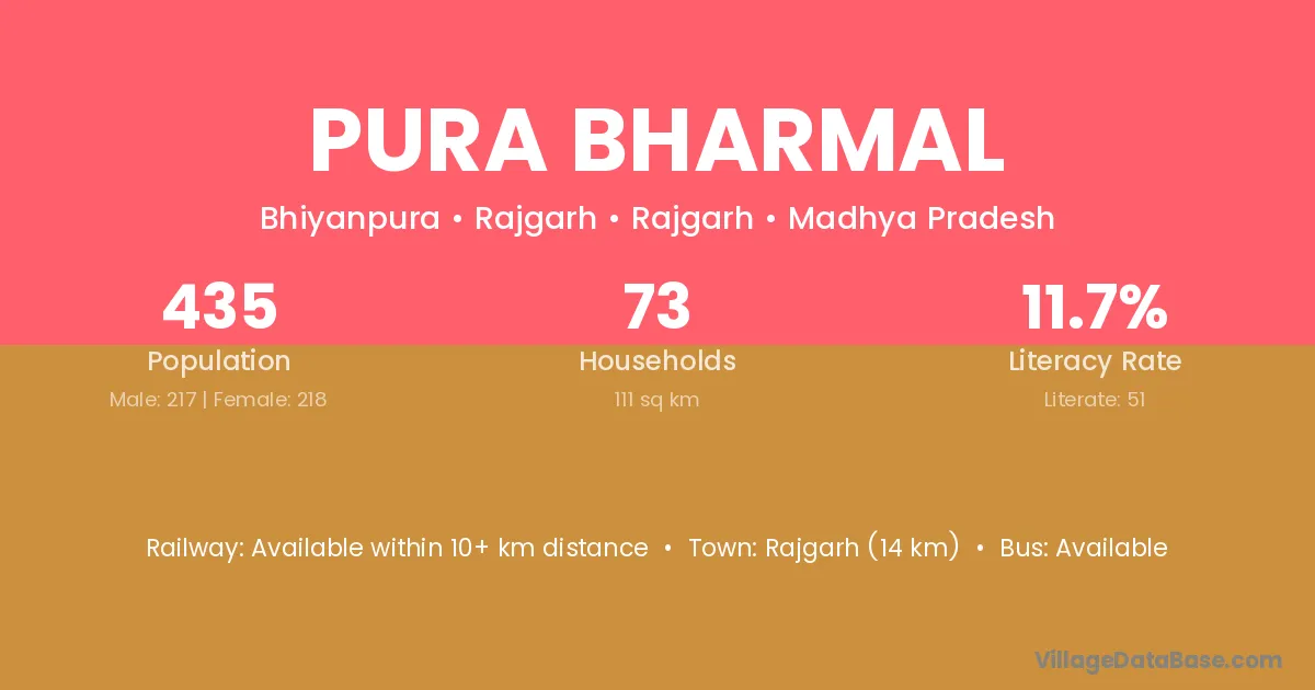 Pura Bharmal village has a total population of 435 people, of which 217 are males and 218 are females.