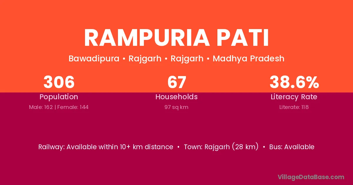 Rajgarh (28 km) is the nearest town to Rampuria Pati village for major economic activities and is located approximately 28 km away.