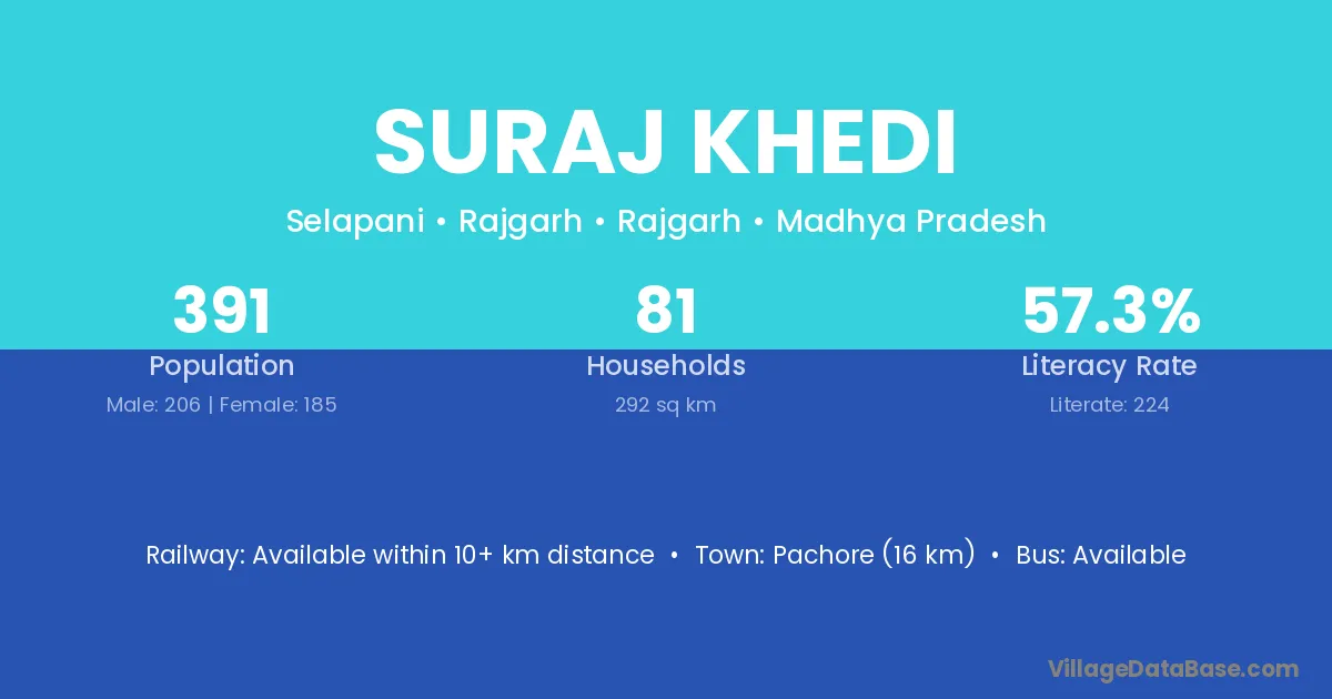 Pachore (16 km) is the nearest town to Suraj Khedi village for major economic activities and is located approximately 16 km away.