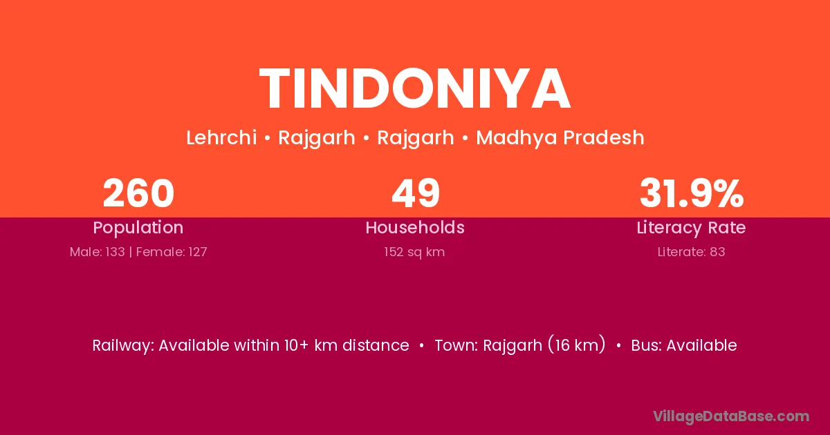 Rajgarh (16 km) is the nearest town to Tindoniya village for major economic activities and is located approximately 16 km away.