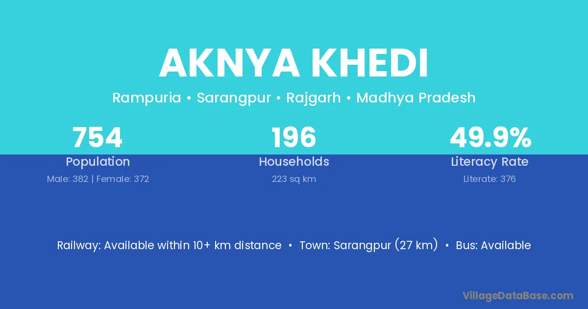Sarangpur (27 km) is the nearest town to Aknya Khedi village for major economic activities and is located approximately 27 km away.