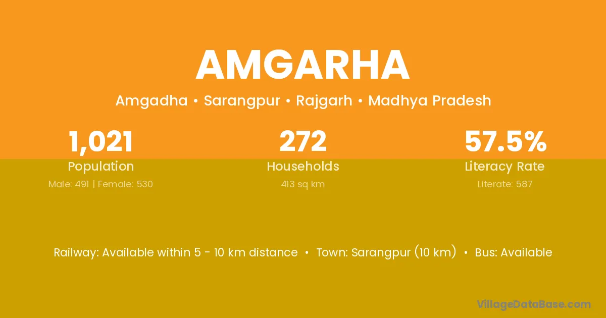 Sarangpur (10 km) is the nearest town to Amgarha village for major economic activities and is located approximately 10 km away.