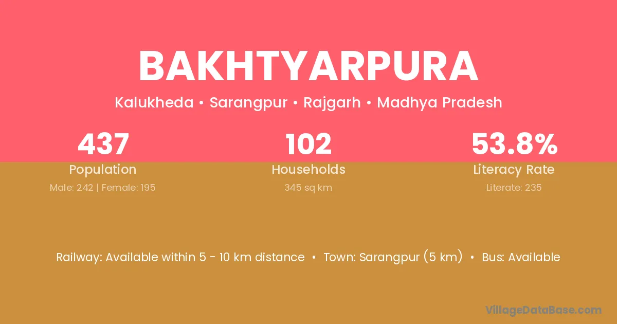 Sarangpur (5 km) is the nearest town to Bakhtyarpura village for major economic activities and is located approximately 5 km away.