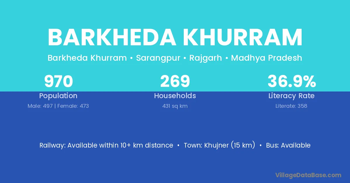 Barkheda Khurram village has a total population of 970 people, of which 497 are males and 473 are females.