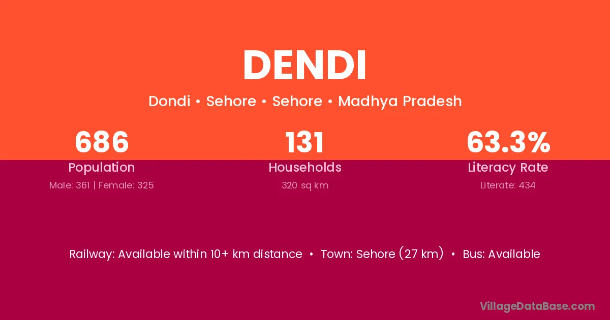 The literacy rate of Dendi village is 63.13%. Male literacy stands at 75.31% and female literacy at 50.32%.