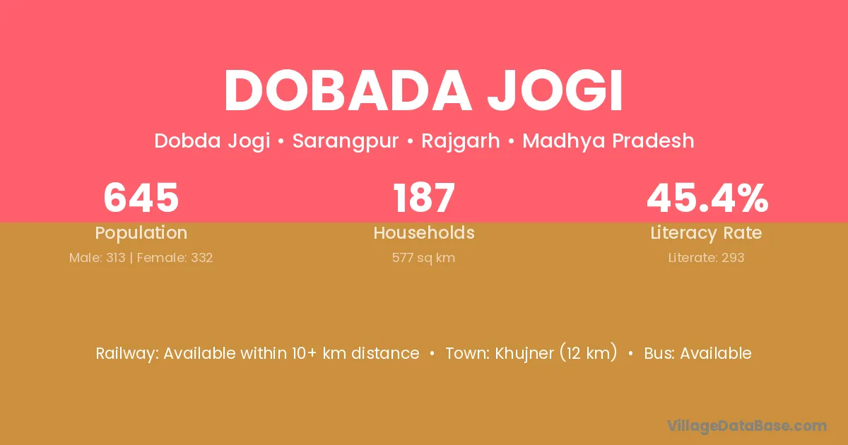 Khujner (12 km) is the nearest town to Dobada Jogi village for major economic activities and is located approximately 12 km away.