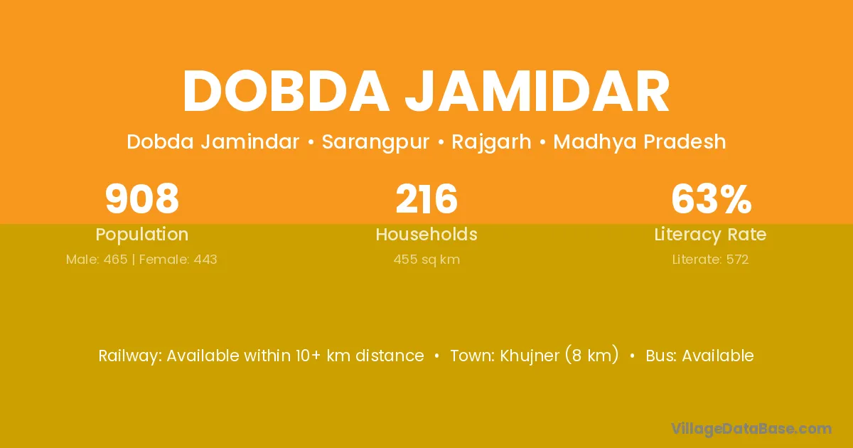 Dobda Jamidar village has a total population of 908 people, of which 465 are males and 443 are females.