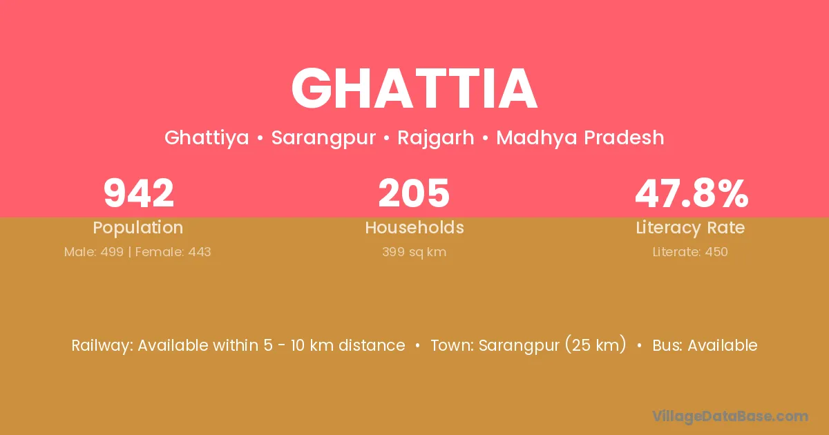 Sarangpur (25 km) is the nearest town to Ghattia village for major economic activities and is located approximately 25 km away.