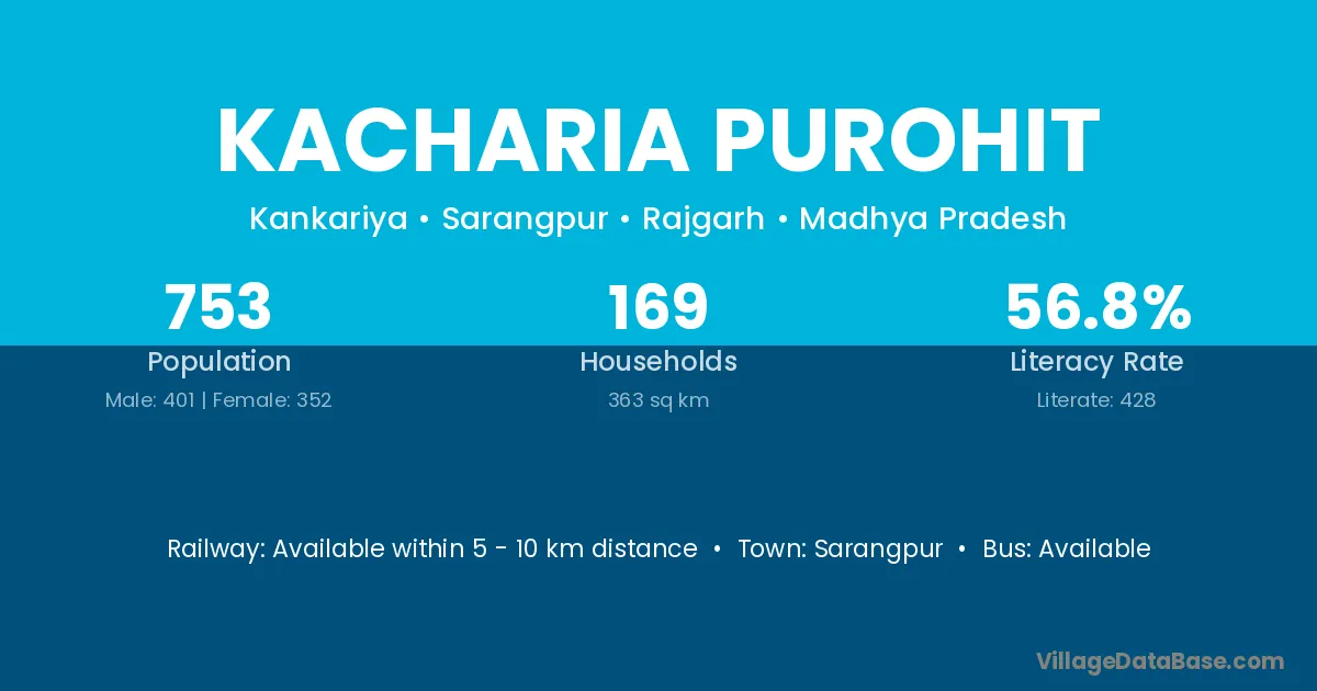 Sarangpur is the nearest town to Kacharia Purohit village for major economic activities