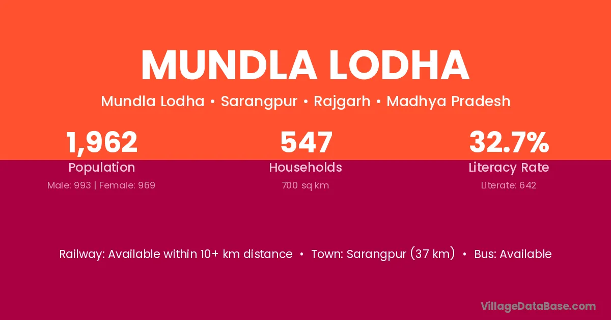 Sarangpur (37 km) is the nearest town to Mundla Lodha village for major economic activities and is located approximately 37 km away.