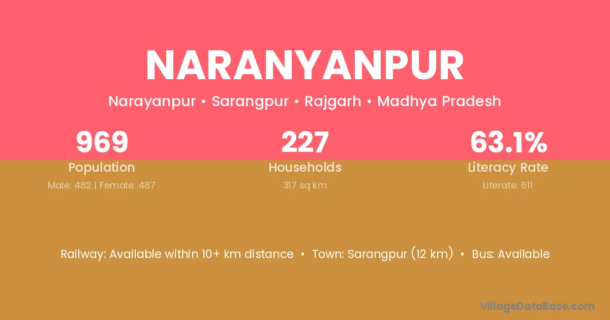 Sarangpur (12 km) is the nearest town to Naranyanpur village for major economic activities and is located approximately 12 km away.