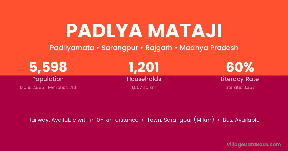 Sarangpur (14 km) is the nearest town to Padlya Mataji village for major economic activities and is located approximately 14 km away.