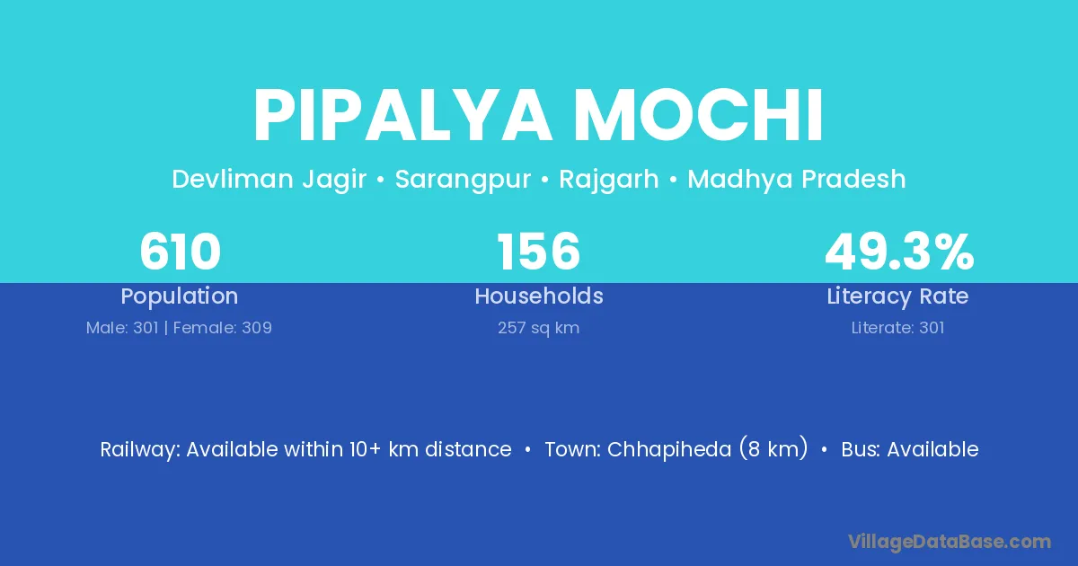 Pipalya Mochi village has a total population of 610 people, of which 301 are males and 309 are females.