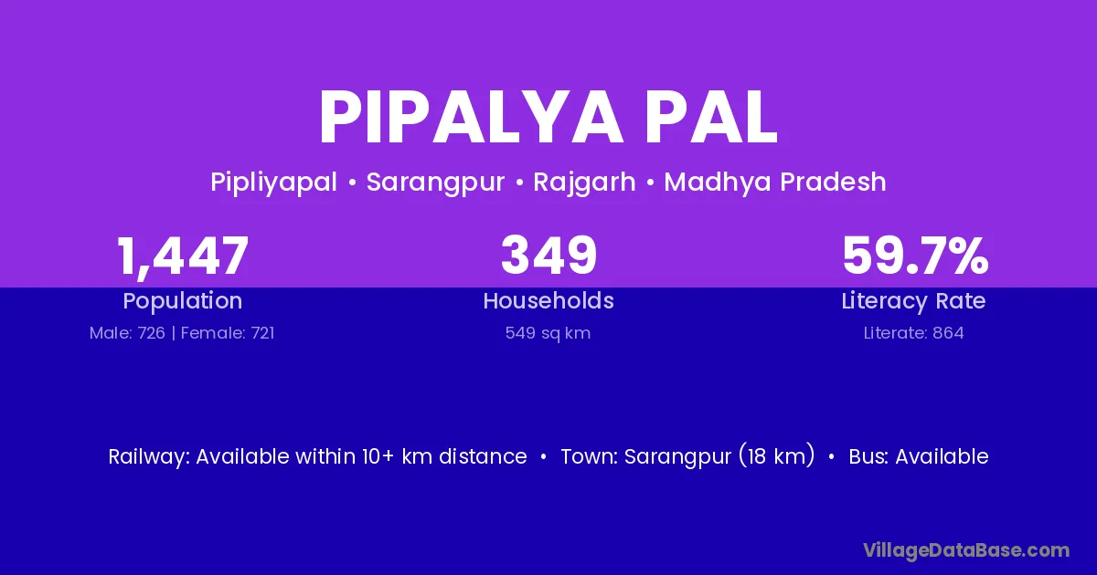 Sarangpur (18 km) is the nearest town to Pipalya Pal village for major economic activities and is located approximately 18 km away.