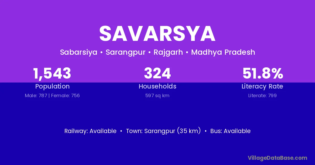 Sarangpur (35 km) is the nearest town to Savarsya village for major economic activities and is located approximately 35 km away.
