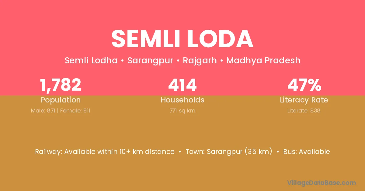 Sarangpur (35 km) is the nearest town to Semli Loda village for major economic activities and is located approximately 35 km away.