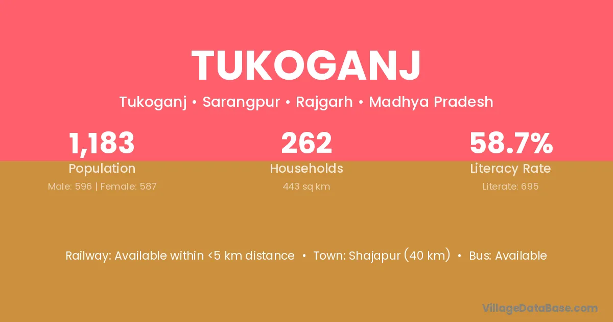 Tukoganj village has a total population of 1,183 people, of which 596 are males and 587 are females.