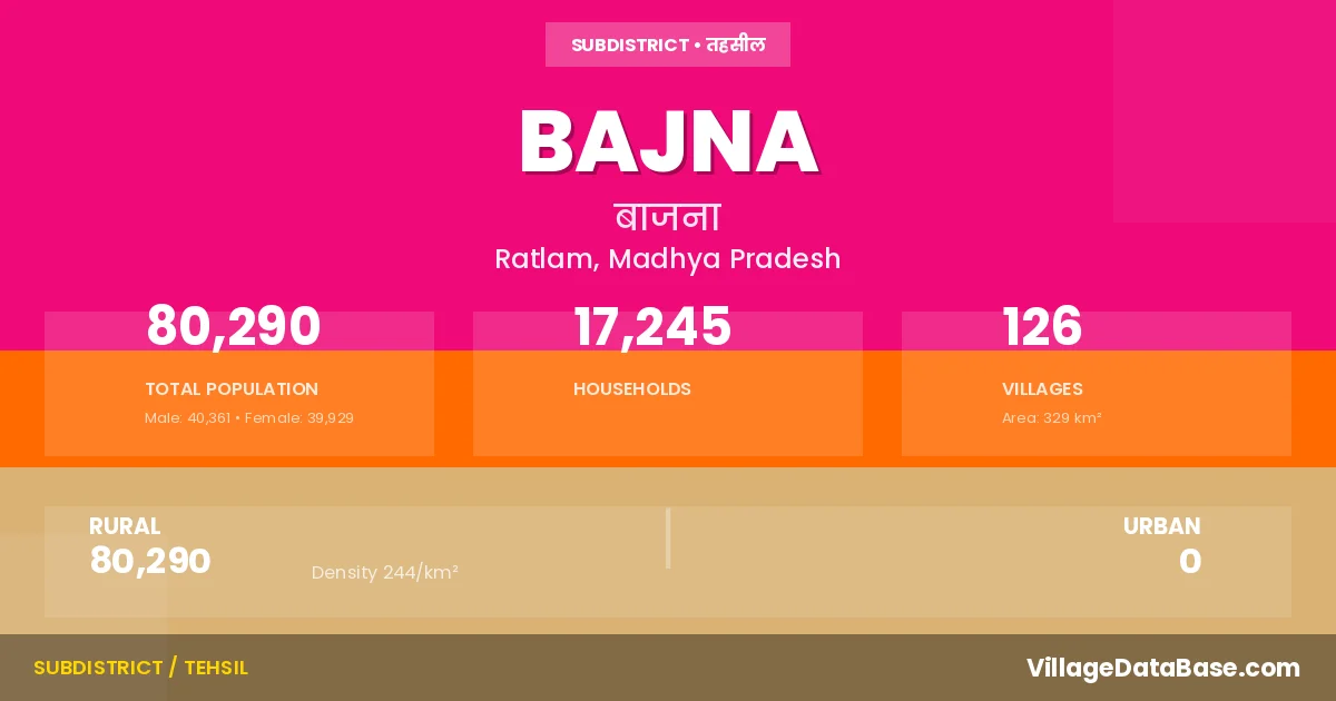 Bajna is a town and Tehsil in the Ratlam district of the Madhya Pradesh. In India, a Tehsil is a subdivision of a district responsible for the administration and revenue collection of a specific area within the district. Tehsils play a crucial role in the local governance structure, contributing significantly to the development and administration of their communities.