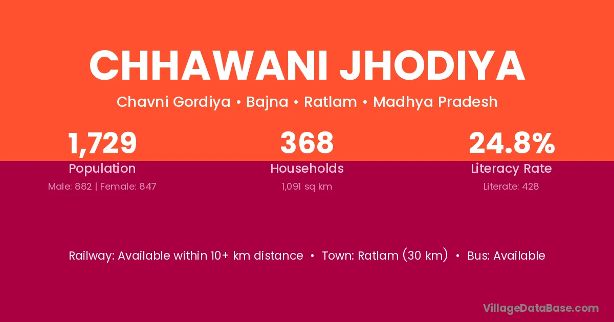 Chhawani Jhodiya village has a total population of 1,729 people, of which 882 are males and 847 are females.