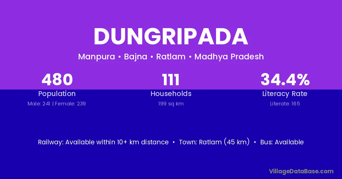 Ratlam (45 km) is the nearest town to Dungripada village for major economic activities and is located approximately 45 km away.