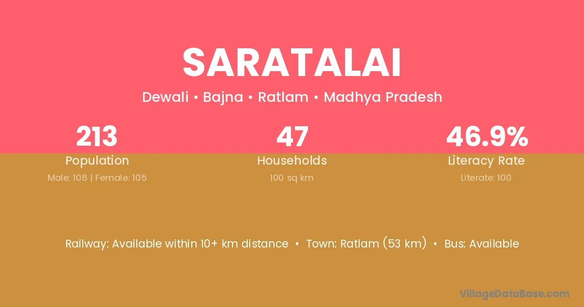 Ratlam (53 km) is the nearest town to Saratalai village for major economic activities and is located approximately 53 km away.