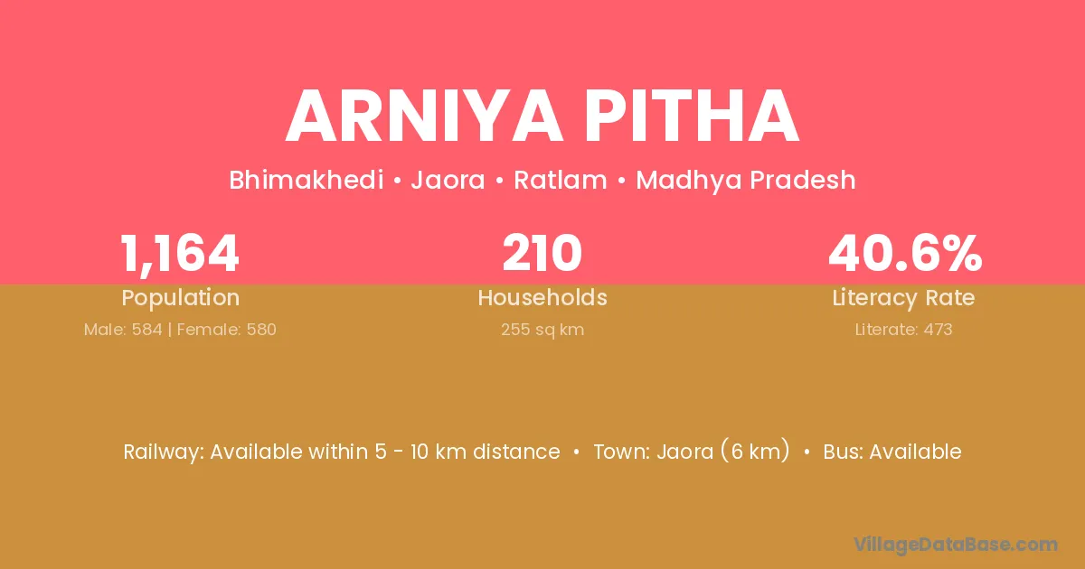 Jaora (6 km) is the nearest town to Arniya Pitha village for major economic activities and is located approximately 6 km away.