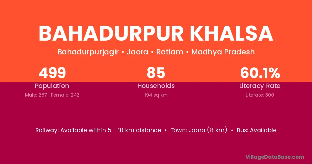 Jaora (8 km) is the nearest town to Bahadurpur Khalsa village for major economic activities and is located approximately 8 km away.
