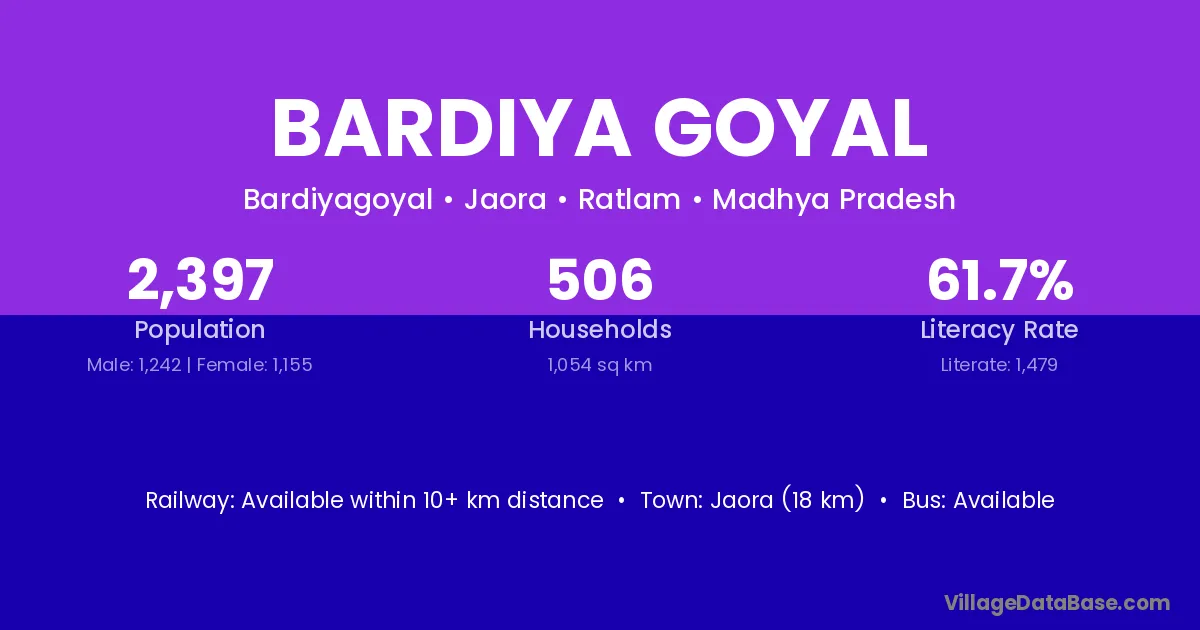 Jaora (18 km) is the nearest town to Bardiya Goyal village for major economic activities and is located approximately 18 km away.
