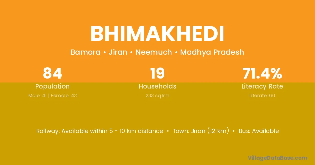 Jaora (3 km) is the nearest town to Bhimakhedi village for major economic activities and is located approximately 3 km away.