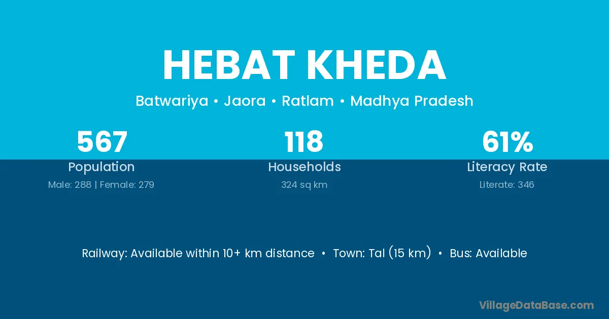Hebat Kheda village has a total population of 567 people, of which 288 are males and 279 are females.